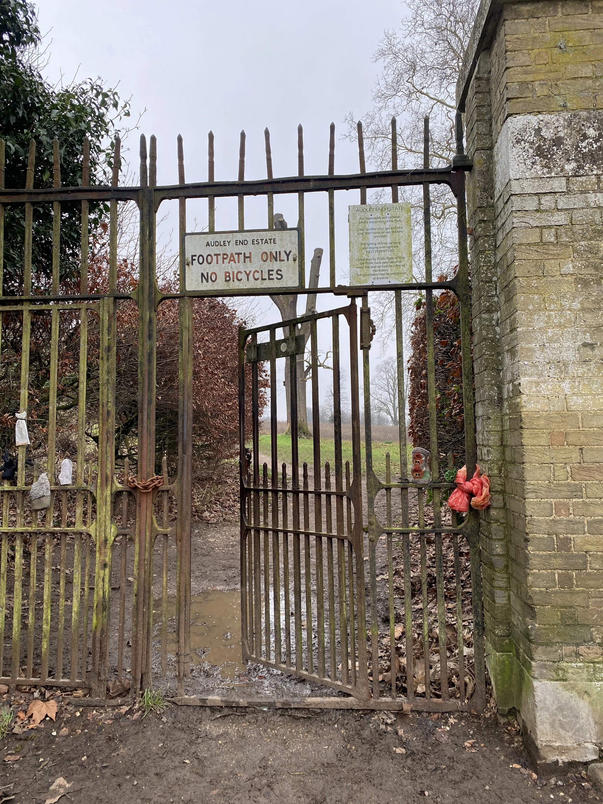 We wander out of the town centre, and soon we reach a tall gate that opens out to a semi-rural path towards Audley End House. I wonder who feels comfortable enough to push it and cross the threshold from town into country. Who feels seen and who feels watched. Access is never neutral. The gate feels like a first barrier.