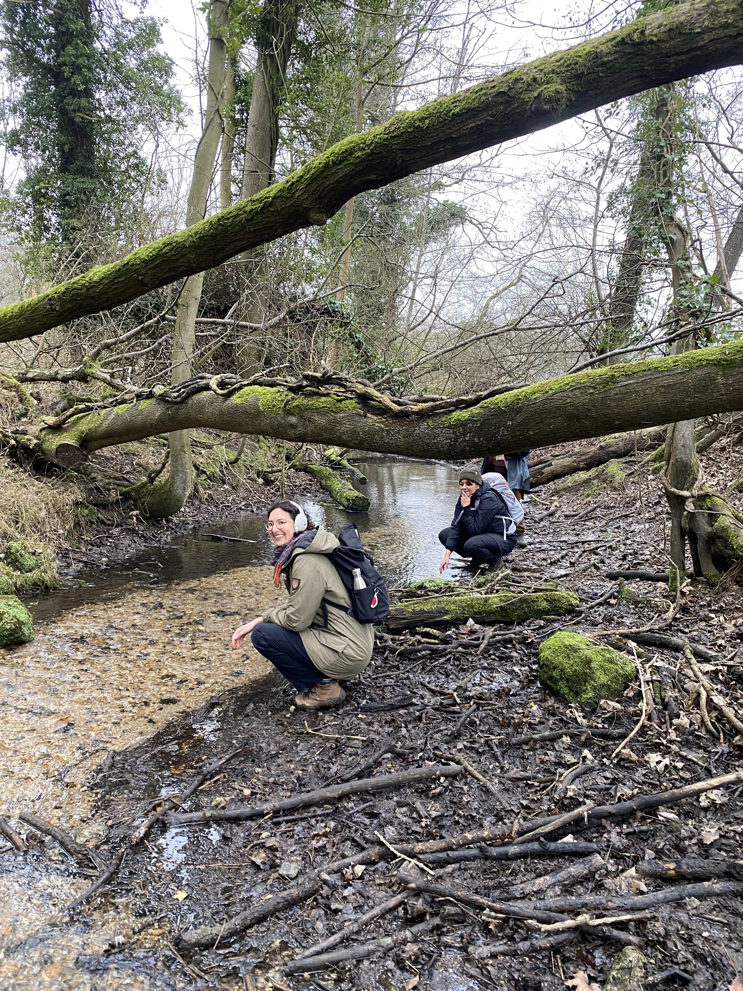 We stop briefly at a location where the fast-running water runs clear and bare trees bend over it. A quiet place to be with land and water. To feel alive and present. I’m reminded of the importance of water, of noticing and noting where it flows, and where it meets and diverges. Water to wash away, to cleanse, to cure, to drink, to drink, to drink – and to think, to formulate. Machine formulations, human and non-human. Water is the source. It feeds everything.
